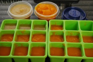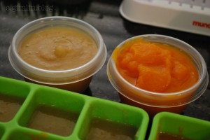 In the end I got 1 fresh apple and carrot puree each, and 2 full trays of frozen cubes for later use.