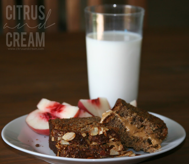 Toast two 1/2 inch thick slices of banana bread. (You can do this in your toaster or in the oven.) Let cool slightly, and generously spread peanut butter on one. Get creative and add chocolate shavings, a drizzle of honey, or extra chopped nuts! Top with the second toasted slice, cut, and serve!